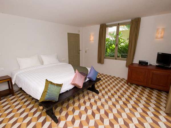 Situated on the first floor of the garden houses named Banan, Sampov, and Ek Phnom, are the six Deluxe Superior Rooms offering a choice of antique Khmer king, queen, or twin beds and private bathrooms. Each room boasts a private balcony with a table and chairs, providing a comfortable space to relax and enjoy the surroundings.