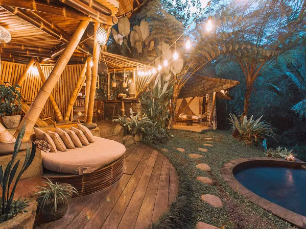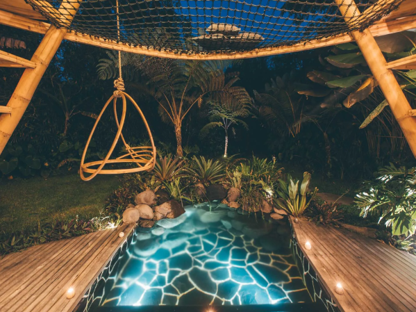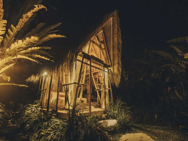 Hideout Falcon: A modern bamboo cabin featuring a private garden, heated outdoor tub, hanging net, and romantic lighting—perfect for honeymooners.