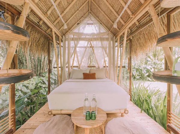 Hideout Zen: Inspired by Japanese minimalism, this secluded A-frame bamboo villa includes a kitchenette, king-size bed, bathroom, and an outdoor shower in a calming, nature-focused design.