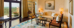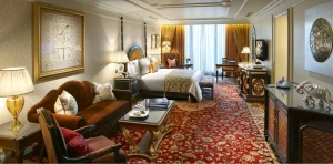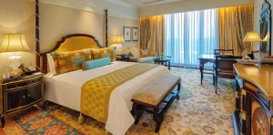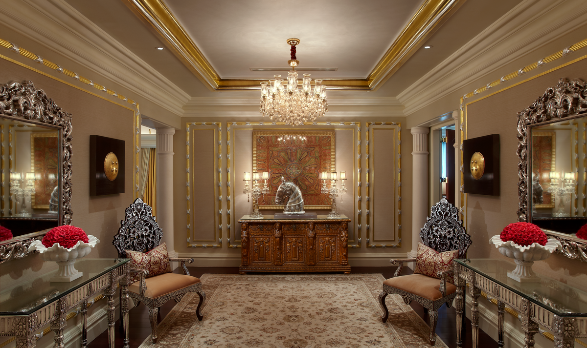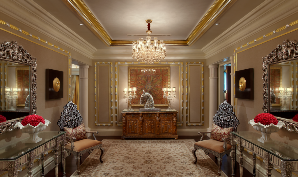 - Presidential Suite: Ultimate luxury is offered in this suite spanning 446 square meters. Gold leaf accents, art pieces and a regal ambience that transports you to a world of pure elegance. This 8 bedroom suite has its own private gym, two living rooms, a private study, 12-seater dining table, and butler’s pantry. The master bedroom has its own Jacuzzi and couple’s spa suite.