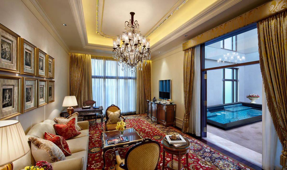 Grand Suite with Plunge Pool: Spanning 101 square meters, this Grand Suite is on the ninth floor with regal decor and furnishings making it a serene space to unwind and relax during your stay. Featuring an open-to-sky private pool with Jacuzzi. Enjoy exclusive privileges including airport transfers, luxurious bathroom amenities, and access to the Royal Club.
