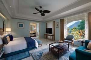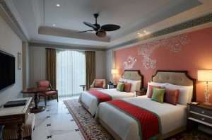 - Royal Suite: A magnificent entrance with an elaborate marble planter artistically ornamented with fragrant frangipani greets you as you approach the Royal Suite. This gorgeous two-bedroom suite, which is 2314 square feet in size and is decorated in gentle coral blush tones, offers the ideal balance of modern sophistication and history. Along with hand-tufted carpets, a chic four-seater dining area, a premium living room, a walk-in closet and an opulent four-fixture bathroom, the suite boasts a magnificent king bedroom and an exquisite twin bedroom. Each area has been thoughtfully chosen to provide sophisticated comfort and a subtle sense of luxury. Spend time on your own private patio and unwind by the temperature-controlled private pool, complete with a Jacuzzi.