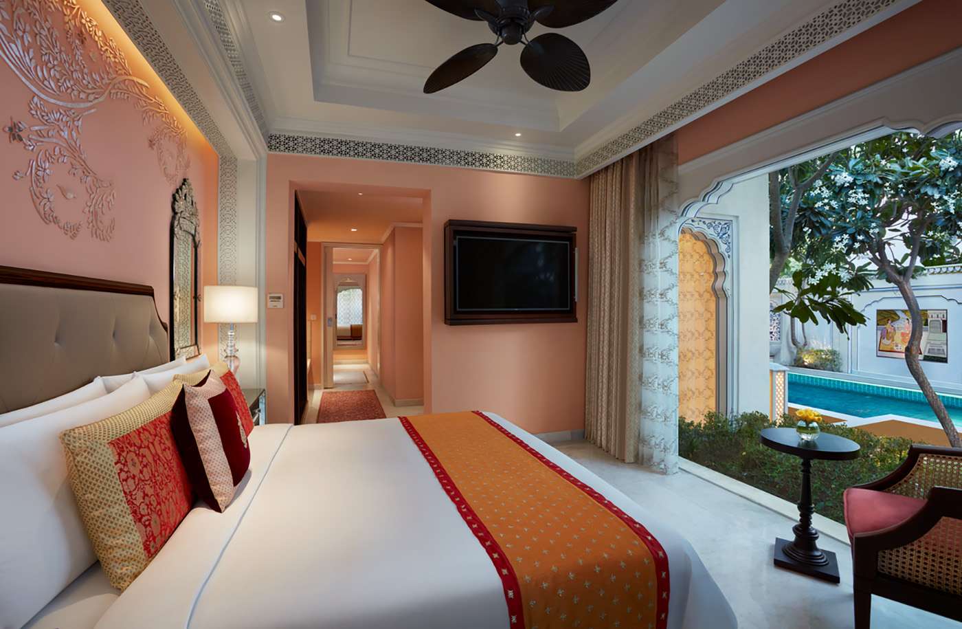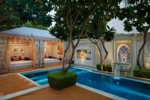 A tastefully furnished 1238 square foot retreat that masterfully blends ancient Indian architecture with sophisticated modern design, you can enter a realm of regal tranquility. Every area is decorated in gentle coral tones and is a celebration of classic beauty and creative craftsmanship. The luxurious bedroom features marble flooring with elaborate inlay, bedside trays made by Tarkashi, hand-tufted carpets, and a headboard ornamented with silver leafing and Tikri glass floral design. Sparkling crystal chandeliers and an elegant antique fan with blades shaped like lotus leaves give this lovely room a dash of grandeur. Indulge in your own private temperature controlled plunge pool with jacuzzi and day beds.