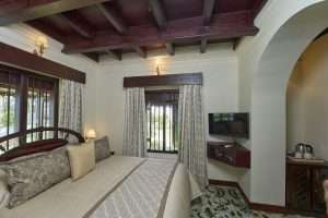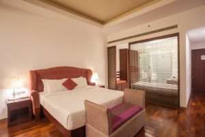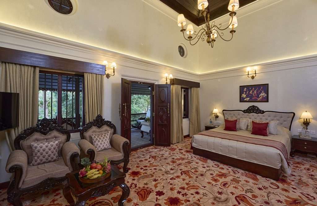 The hotel features 90 rooms and 9 suites, along with a range of distinctive accommodations including heritage wings, tower blocks, private villas, and traditional tharavadu cottages.