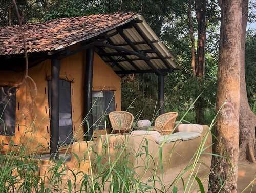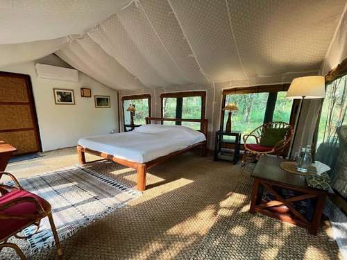 The six comfortable tents, are spaciously set within a young, indigenous woodland. Simple but stylish, the bedroom is softly draped in white block-printed cotton, and set with a large, comfortable bed, soft pillows and locally-crafted furniture. The spacious bathroom has twin-basins, separate toilet and shower room and a large area to store luggage. For convenience, there are a number of electricity points inside the tent and a hairdryer is also provided. Each tent has its own private, cushioned verandah where you can relax, enjoy the birdlife, bathe in the sun and gaze up at the stars.