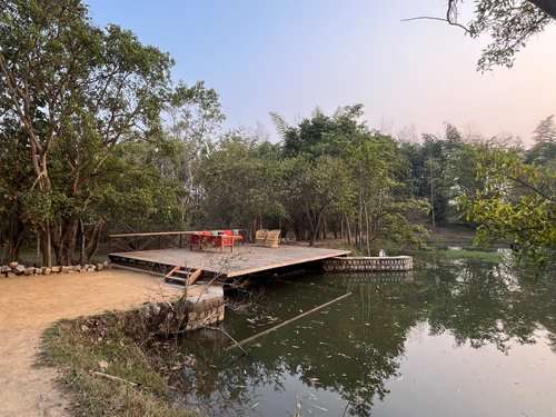 Meals are served communally in the main house or on the spacious verandah overlooking the small lake which attracts a variety of birds. Lunches are light salads using fresh local ingredients and dinners are prepared in the style of a traditional Indian home. Continental food can also be provided on request.