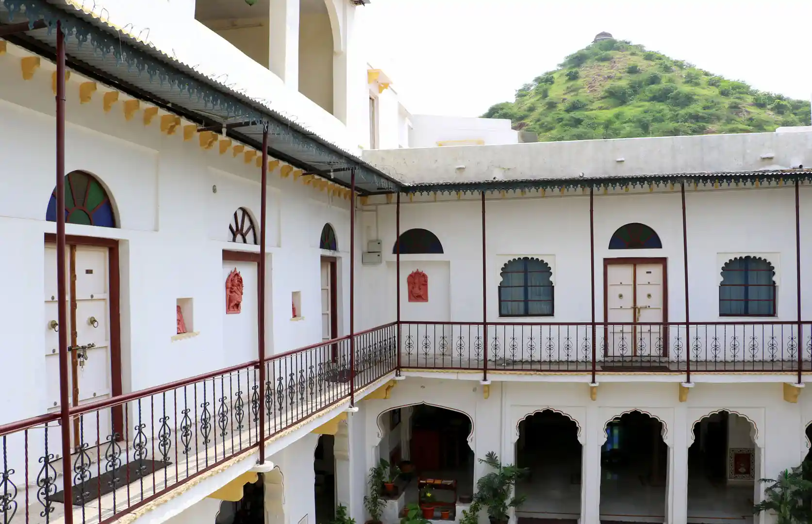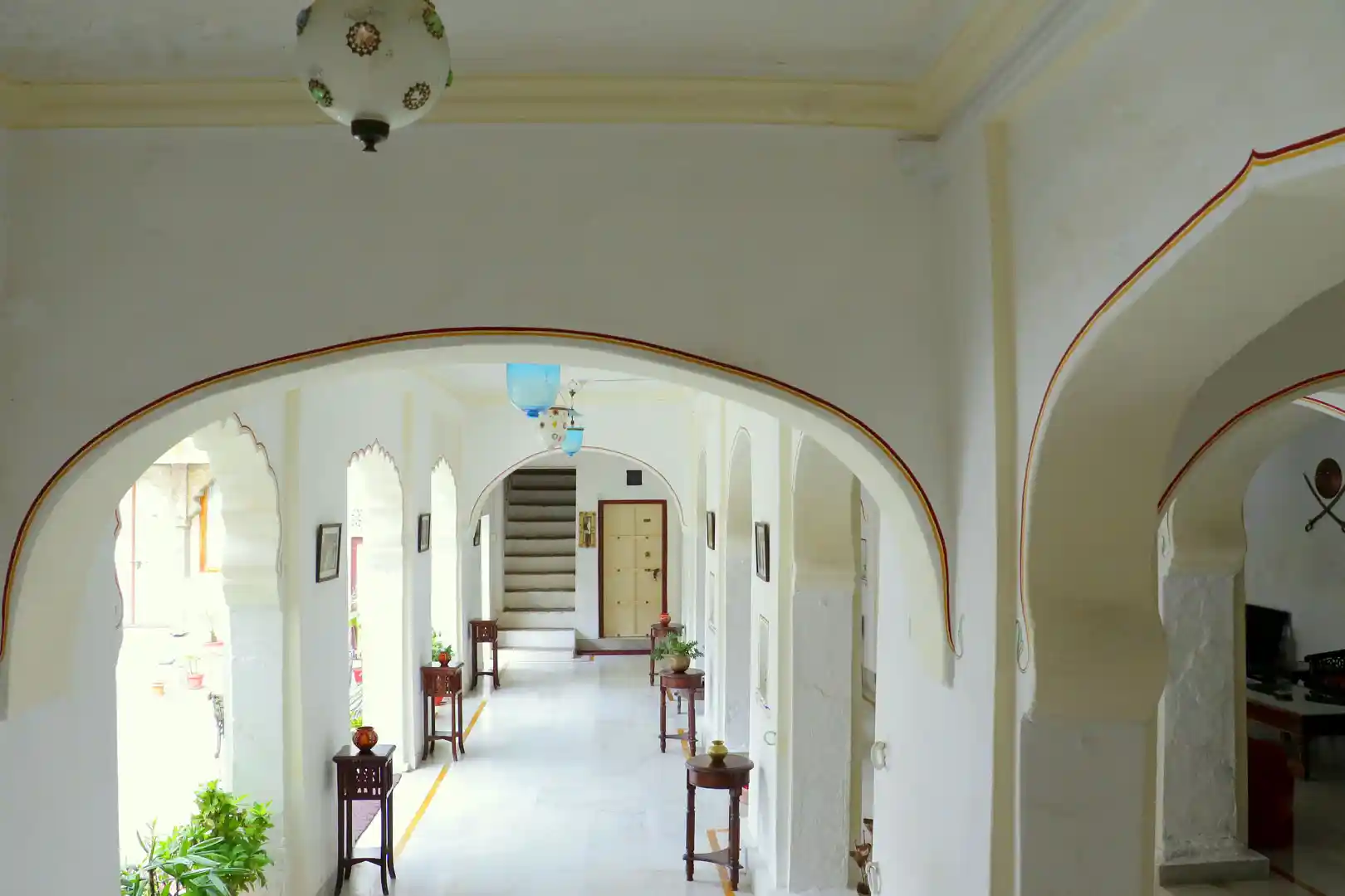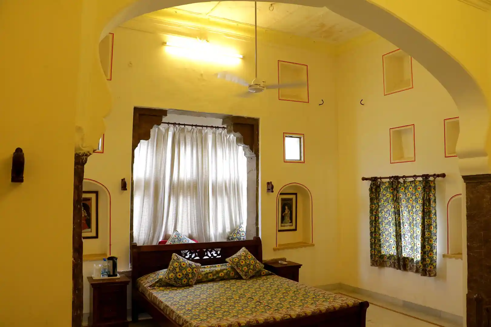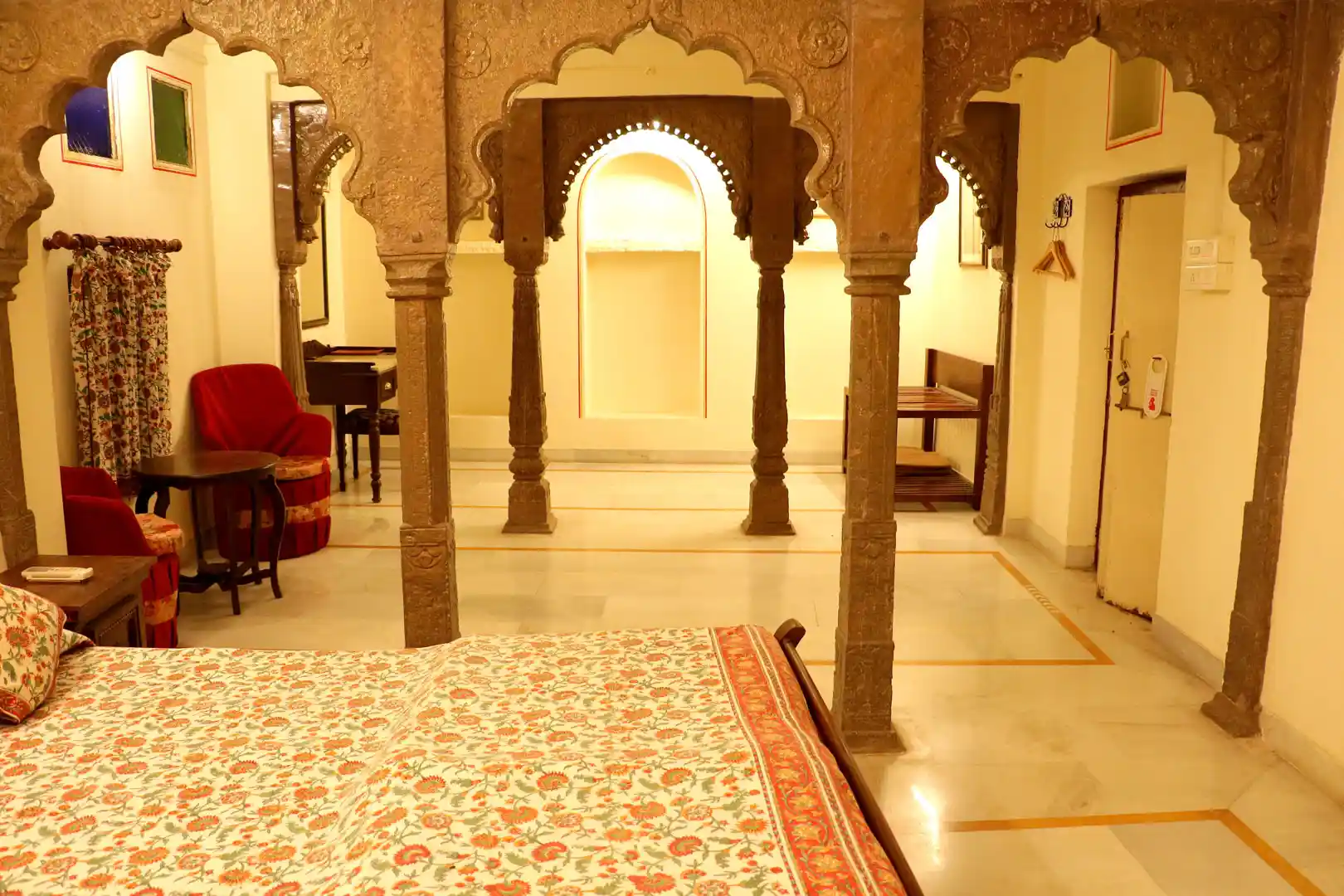 The property is accessed via a narrow alleyway and is surrounded by a cluster of havelis and temples. Step through the archway and you enter a spacious open courtyard with seating and water fountains. The rooms and suites are centered around the courtyard and have been sympathetically restored in line with the heritage of the property and the city. The rooms are compact and cosy with old alcoves and frescoes while the suites are spacious and opulent and have intricate paintings. No two rooms are the same, each has their own particular charm. All have period furniture and artwork. The hotel offers all modern amenities including WiFi, laundry service and medical assistance.