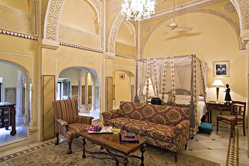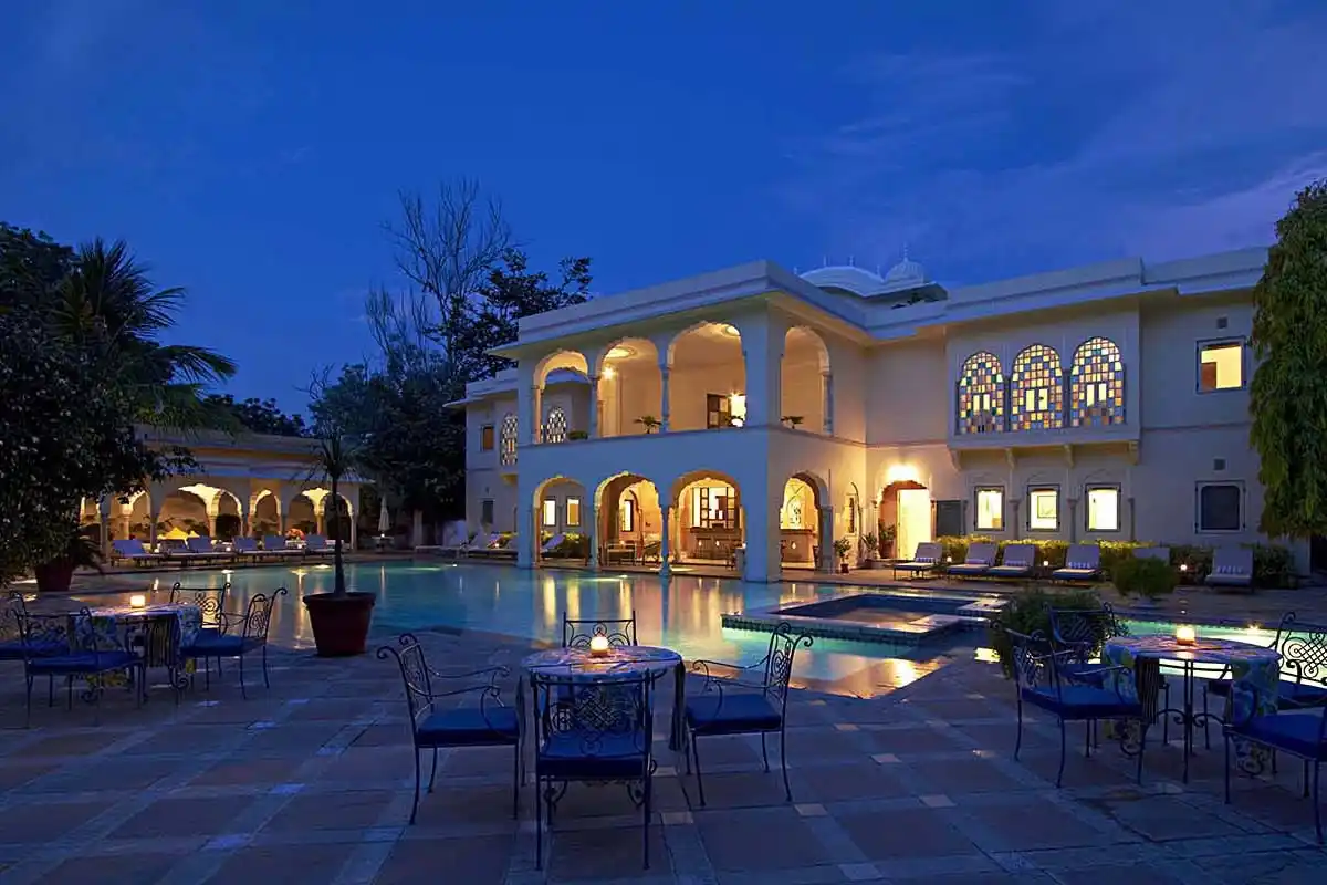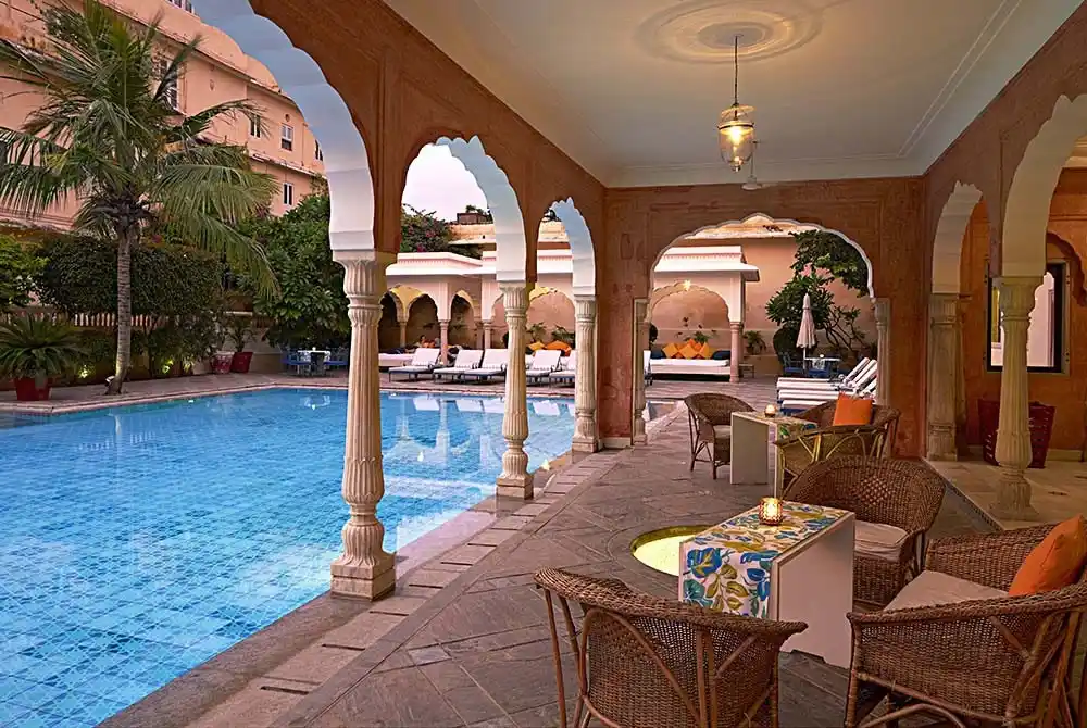 This restored 150 year old haveli (mansion) in the heart of old Jaipur has character in abundance. No two rooms are the same but all are gorgeously decorated with style and opulence, a few even have a small outdoor terrace. The swimming pool and surrounding relaxation area are simply gorgeous with enormous canopied day beds to chill with a refreshing drink at the end of a busy day. The central courtyard turns into a magical candle lit dinner venue in the evening and the food is very good indeed. All in all, a very impressive package – I loved it!