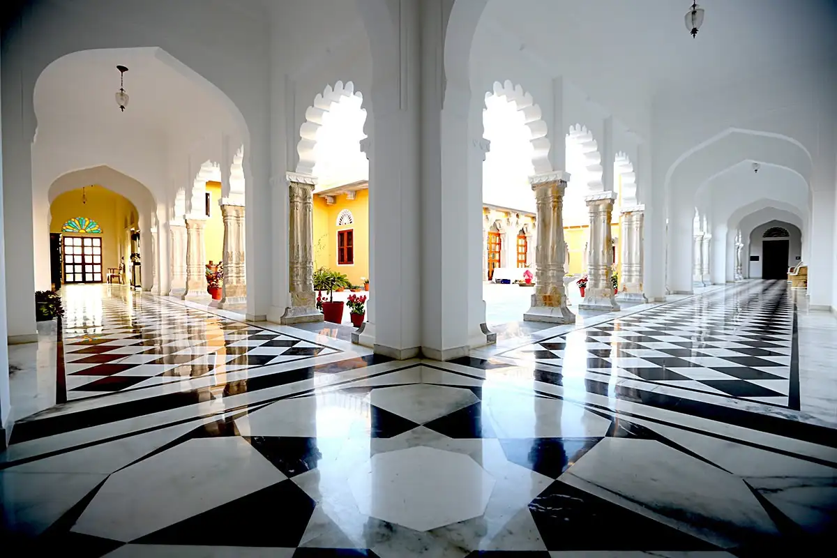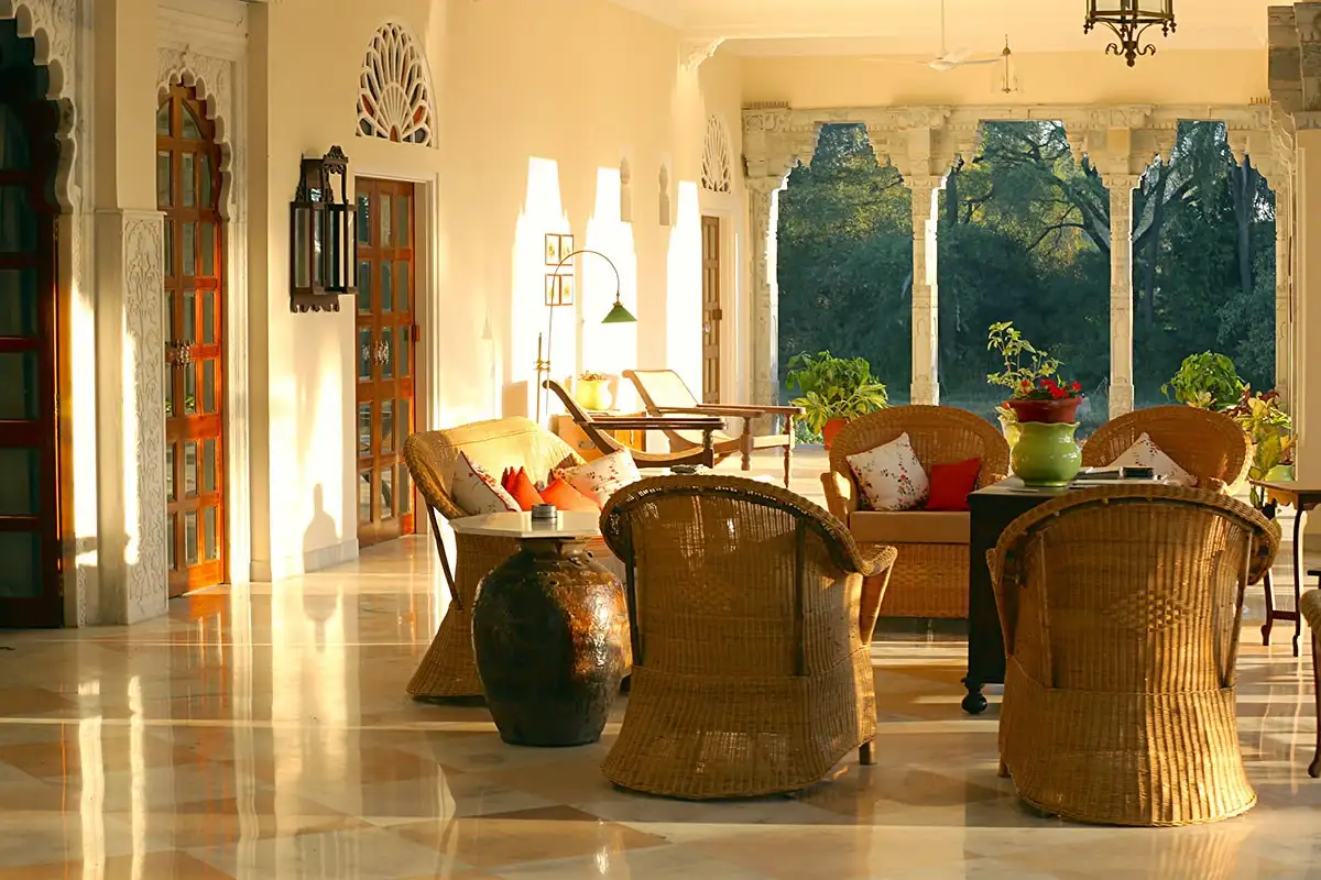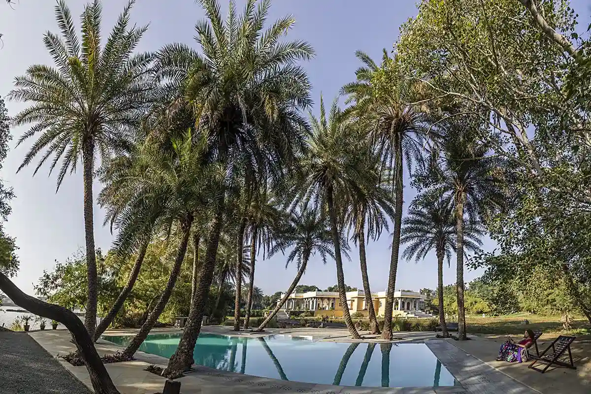 Beyond the rooms which fan off from the pretty central courtyard, there is plenty of room for people to lose themselves in the bar, the dining room or the light-filled sitting room. Courtyards and terraces abound and all this is surrounded by gorgeous lawns and gardens, set back a few metres from Ragho Sagar (lake). Perhaps one of the highlights of this little gem, however, is the gorgeous, shady pool on the lakeside – ideal for whiling away the hours with a drink and a good book.
