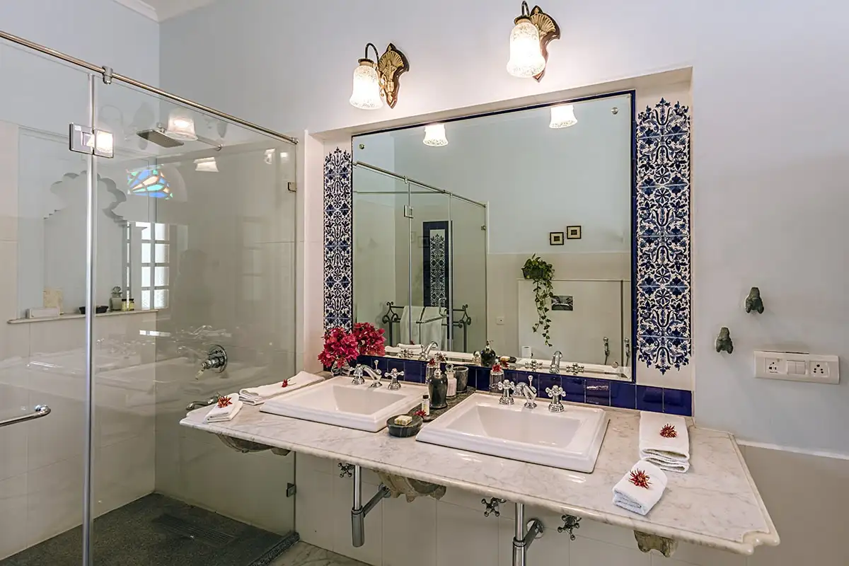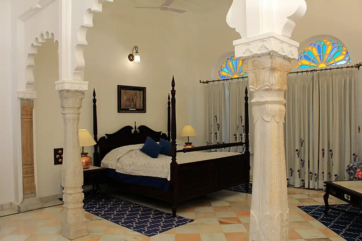 This is a newly built home in the style of a traditional Rajput haveli. It has been stunningly built by local craftsmen to create wide, airy verandahs; pretty inner courtyards; cool corridors; lofty, spacious bedrooms; state of the art bathrooms; indoor and outdoor dining and seating.  It’s all very pretty and very much a home as the owners are your hosts, replete with dogs and family memorabilia of one of Rajasthan’s most affable couples.  There is a relaxing seating area with TV for those who want it and a huge roof terrace ideal for yoga at dawn and drinks at sunset!