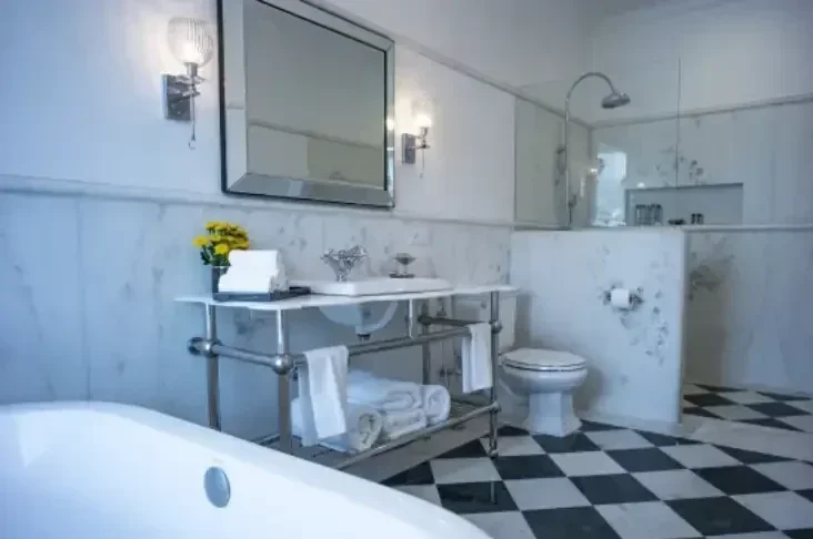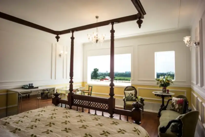 Each of the 9 spacious suites have a large sleeping area with antique four poster beds, enough desk and sitting space for 2 people to live and work comfortably and efficiently, in a soft, elegant ambience, with lots of natural light. Easy-to-manoeuvre wooden shutters on all the windows allow for filtered shade during the hottest parts of the day, and reveal the spectacular views without the need for curtains or blinds. Shades of celadon green, yellow and white are complemented by mirrored furniture and textiles that include our Glenburn signature tea print on the bed linen and hand-embroidered luxury cotton sheets. Collections of art that reflect the historical theme of the hotel fill walls with interesting stories and map out journeys taken by early travellers. Fine carpets adorn the wooden floors to add a touch of warmth, while the cool marble floors of the elegant hallways, dressing rooms and bathrooms provide a welcome respite from the heat. The large ‘white-marble’ bathrooms are equipped with bathtubs and walk-in showers, with lots of natural light and Glenburn Therapy Darjeeling Green Tea bath accessories.