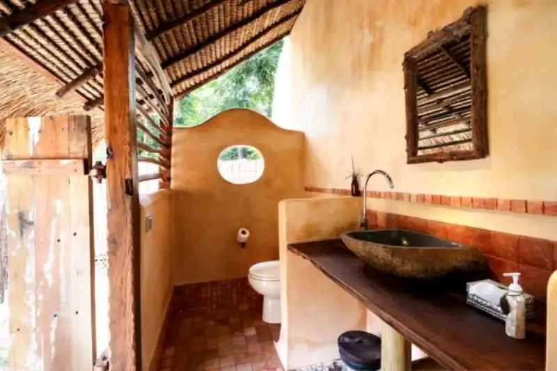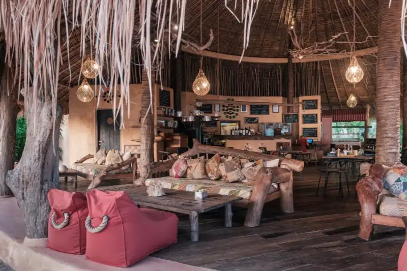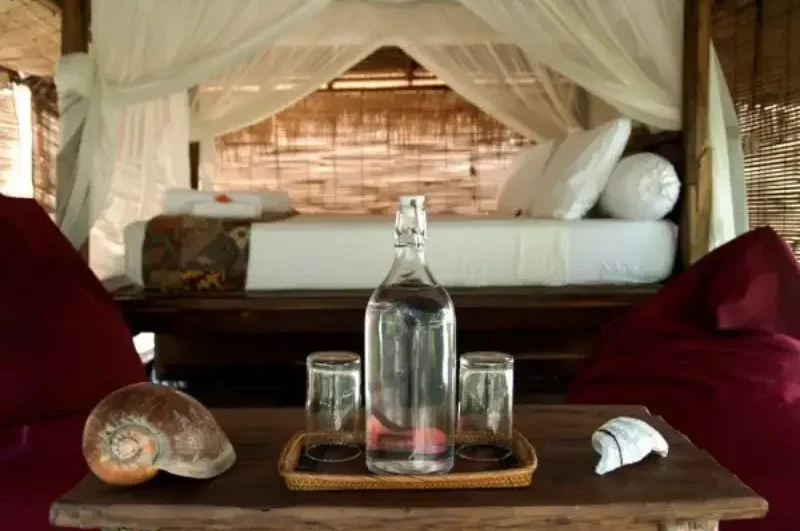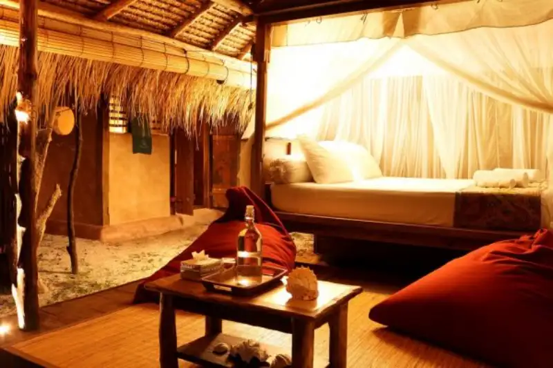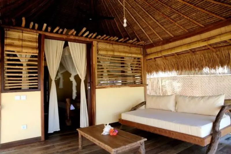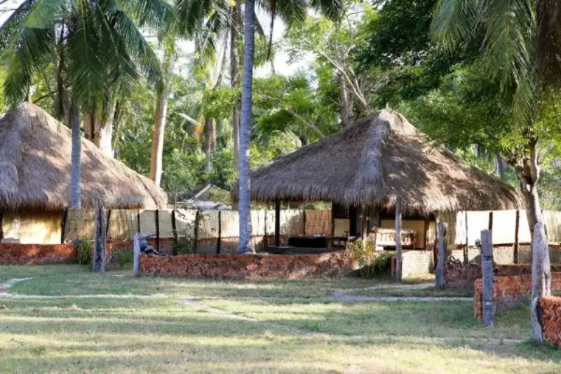 The resort is located on the beach with amazing views. The accommodation is wooden bungalows with thatched roof. The bungalows vary in shape and size, with the most basic having roll up walls to have an open sided sleeping experience.