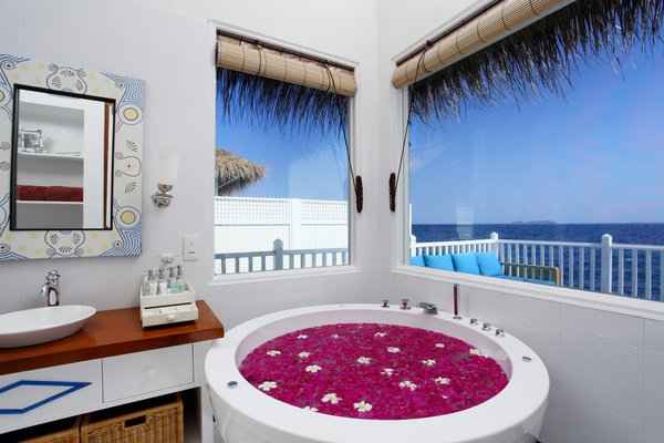 Deluxe Water Villa- Surrounded by beautiful blue water, with views of a stunning sunrise. The room has a private sundeck and direct access to the lagoon.