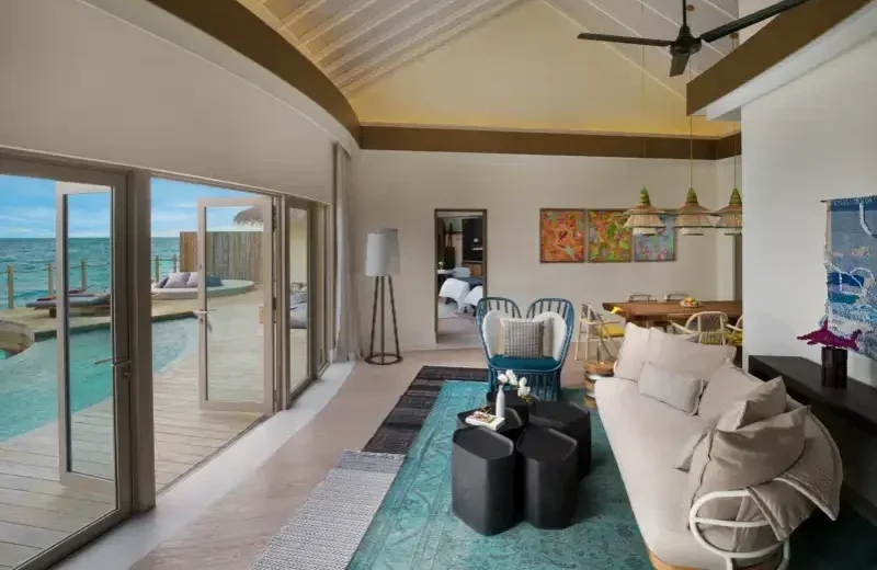 Two Bedroom Overwater Pool Residences: These two bedroom overwater pool residences offer a maximum occupancy of six guest per residence. Each one opens up to a large outdoor deck where you are able to take full advantage of the sun as well as having steps which you can follow directly into the ocean. Featuring twin bed and one king bed both with ensuite bathrooms these residences are ideal for couples or friends who are travelling together. You will also find a large living area, dining area and private infinity pool.