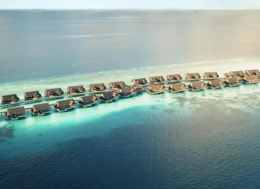 The water villas have been constructed along the shape of the sandbar, creating a natural swimming pool area.