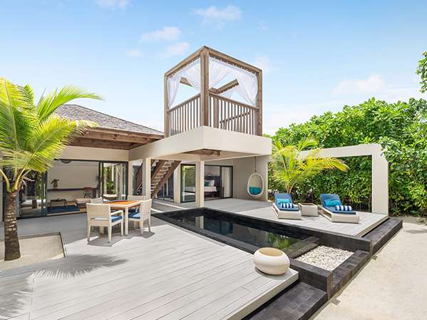 Three-Bedroom Beach Pool Residence: The most spacious option, this lavish 230 square meter residence is designed for families or groups, offering two master bedrooms (with king beds and ensuite baths), a twin-bedroom, and even a massage room. It features a generous indoor living and dining pavilion as well as an outdoor lounge with a plunge pool and sun terraces. Guests can enjoy exclusive perks like a complimentary in-villa couples massage, dedicated butler service, wine cellar, and modern entertainment amenities.