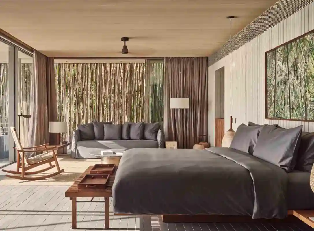 Two Bedroom Beach Pool Villa: Supplying you with a haven of lush tropical greenery outside. These two-bedroom villas also provide you with a soulful, natural materialled inside that echo’s the landscape or outside. To bring the outside in, the three sides of the villa also open up giving you the connection to the nature.