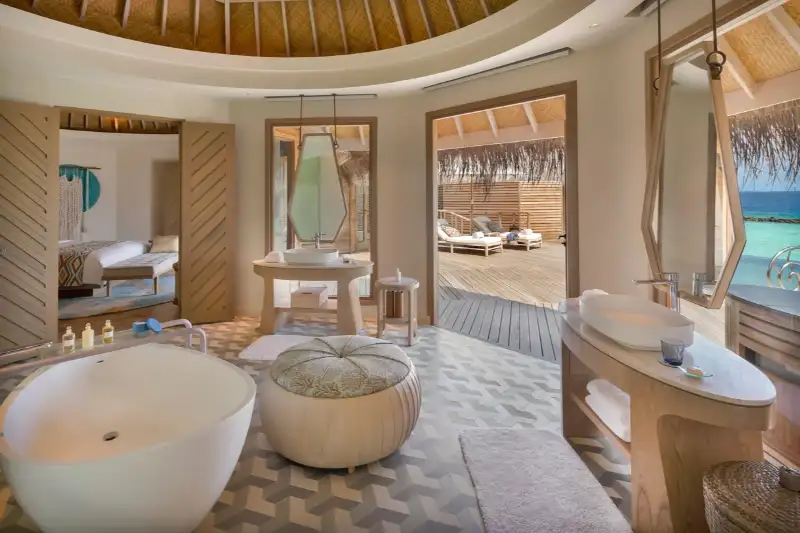 Ocean Residence with a Private Infinity Pool (2): Allowing you to experience bohemian luxury on stilts over the lagoon. These ocean residences include an airy living room as well as a separate bedroom both decorated with the intention to create a custom furnished cocoon. With an additional dining room and attached powder room and wet bar these ocean residences are ideal for families. Experience the views from your own private sundeck which features an infinity pool with steps leading into the ocean.