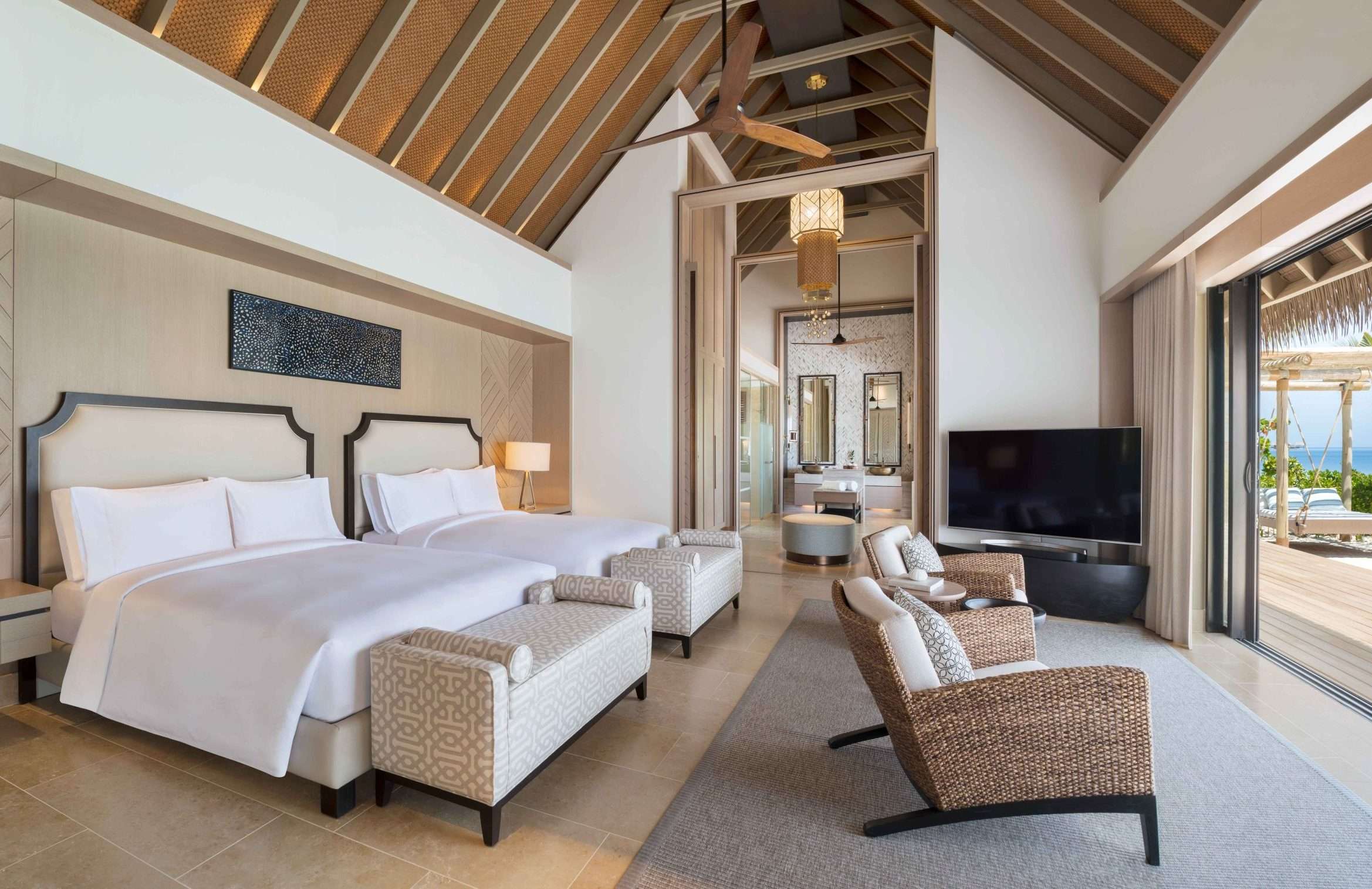 Grand Reef Villa with Pool: From 319 sq.m. / 3,432 sq.ft., sunrise views, pool, indoor / outdoor living, dining area. Accommodates 2 adults, 2 children below 12 years & an infant. A home-away-from-home where guests can take in nature’s beauty from an overwater hammock alongside the infinity pool, soak up the rays on a sun lounger, or enjoy a meal in the dining gazebo. The indoor living and dining room is fully appointed with state-of-the-art entertainment, sofas and floor to ceiling windows . The spacious bedroom has a king-sized or two queen-sized signature Waldorf Astoria beds and sitting area, dressing room and enticing bathroom.