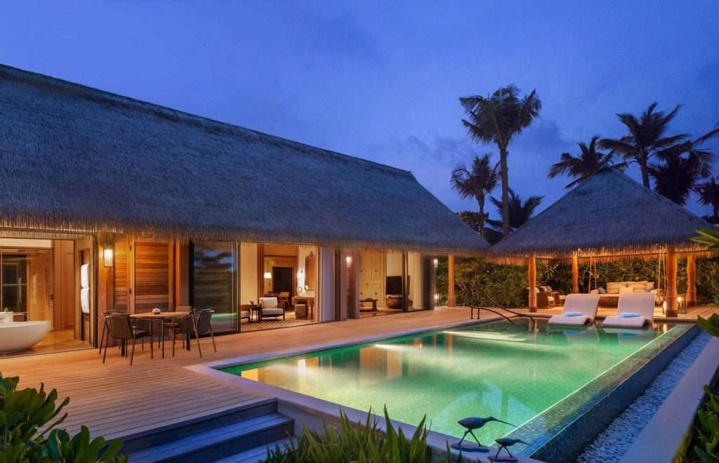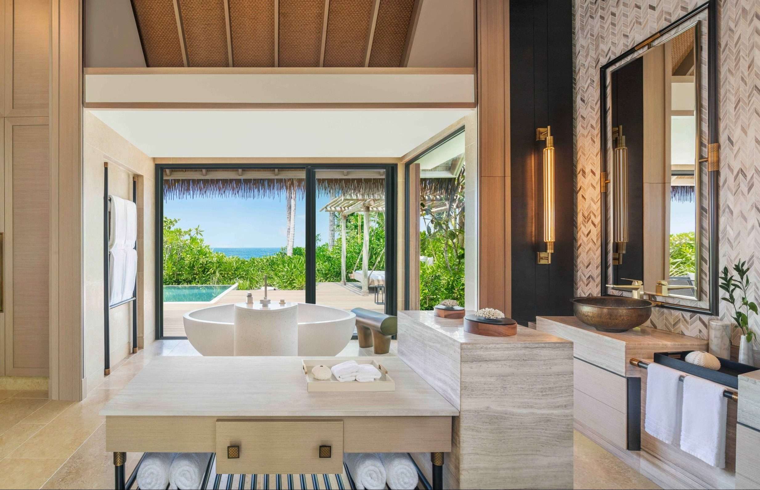Beach Villa with Pool: From 234 sq.m. / 2,518 sq.ft., spacious villa, pool, beach access, pavilion. Accommodates 2 adults & 2 children below 12 years. Retreat to a delightful villa. Floor-to-ceiling windows and sliding doors from both the spacious bedroom and magnificent bathroom present views across the expansive wooden deck, garden and the ocean. The bedroom has a king-sized or two queen-sized signature Waldorf Astoria beds, seating area, 65-inch TV and sound system, while his and hers closets lead through to the bathroom with indoor and outdoor showers, vanities and an oversized bathtub. Enjoy the terrace with pool, hammock, dining pavilion and sun loungers.
