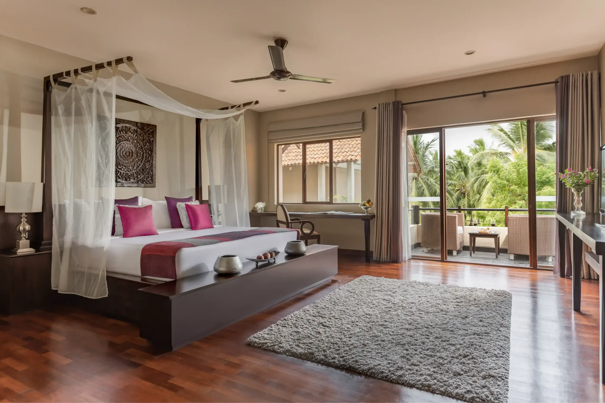 All Studios, Suites, and Villas offer exceptional views of Uga Bay’s lush, palm-lined garden overlooking the ocean. The 22 Ocean Studios provide elevated views from the second floor, while the 24 Beach Studios offer direct access from the ground level. Additionally, there is a two-bedroom Bay Suite and a two-bedroom Beach Villa available for guests.