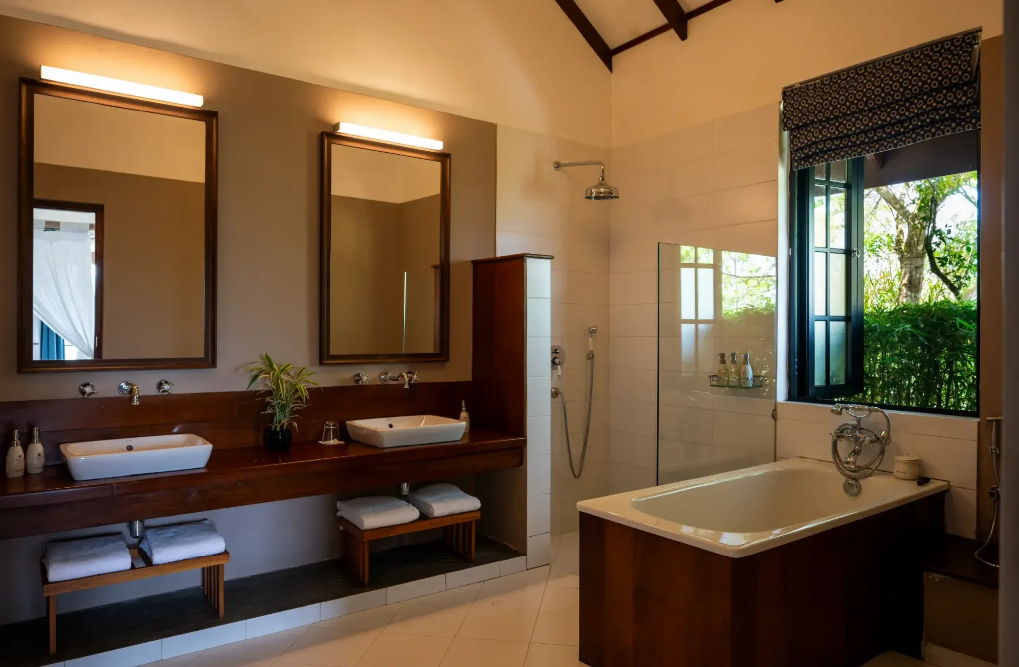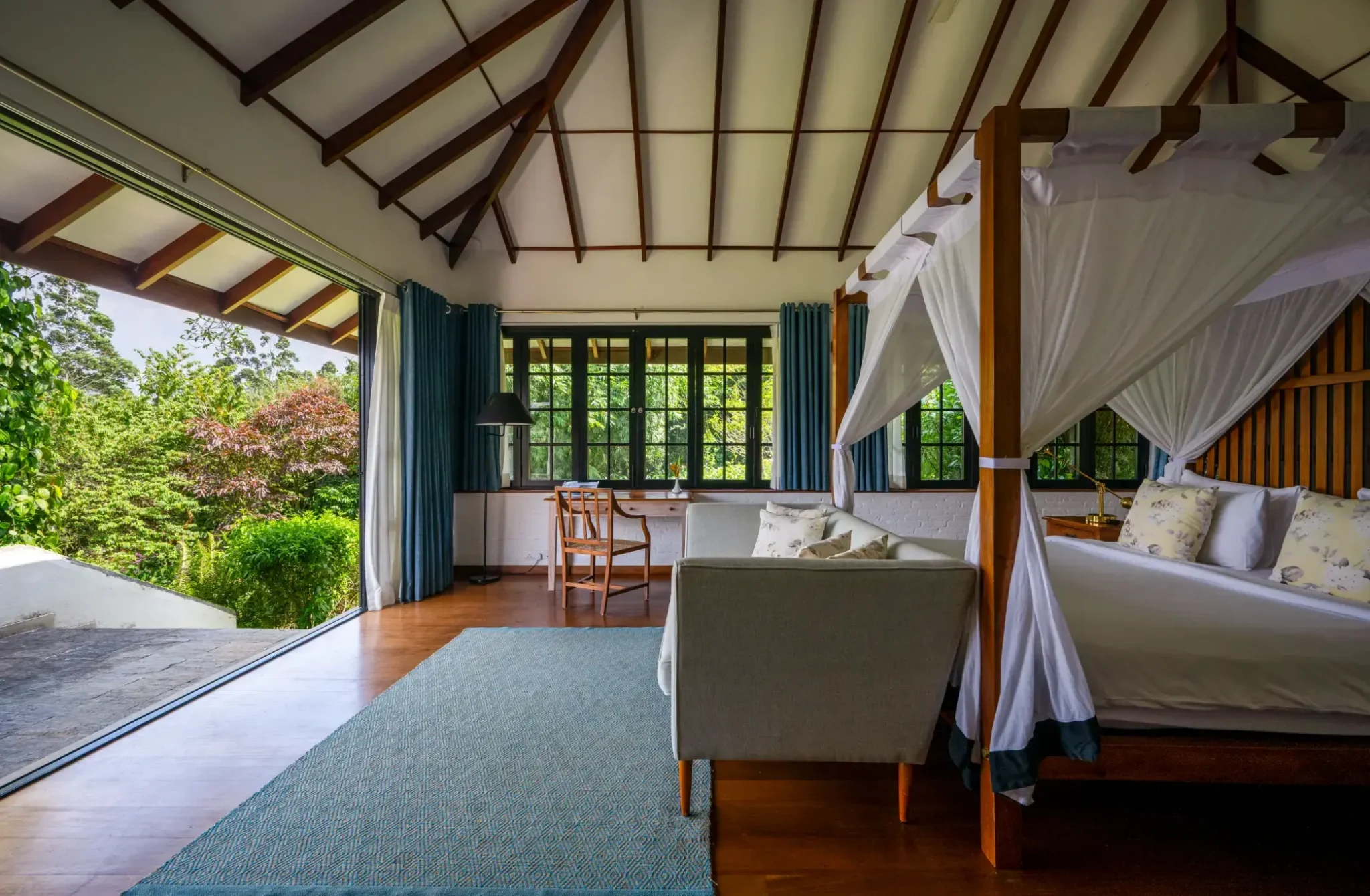 Tucked away at the end of the central hallway, the elegantly appointed Camellia Bedroom offers peaceful views of the lush, jungle-covered slopes of the Peak Ridge Forest. This inviting space features warm timber floors, cosy twin beds with soft linen bedding, an armchair, a sofa bed, a wardrobe, and a writing desk. Step out onto your private veranda to enjoy the surrounding greenery, or unwind in the white-tiled ensuite bathroom complete with a rain shower. Ceiling fans provide a gentle breeze, ensuring comfort during warmer nights.