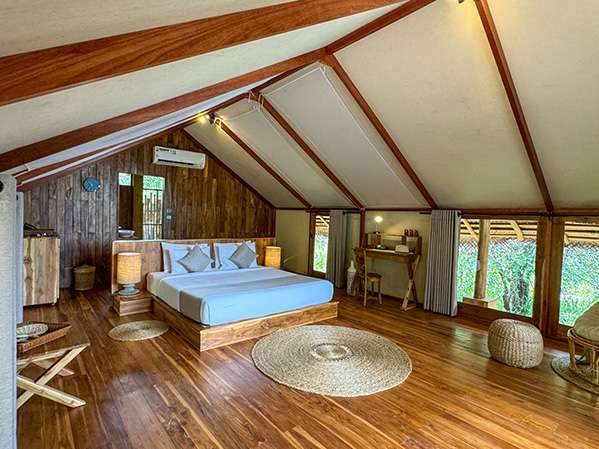 Suitable for up to 4 people with an open-air wooden deck with views of the serene surroundings. This suite features a king sized bed, air conditioning, and luxurious amenities.