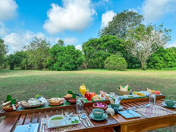 The lodge offers traditional Sri Lankan cuisine for breakfast, lunch and dinner and can also cater for International dishes. From campfire BBQs to five-course meals under the stars, every guest is catered for.