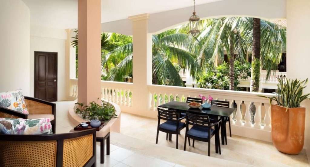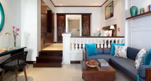 Anantara Garden View Suite: Occupying a prime position with a private corner balcony, spend sunny days in a swing chair overlooking the manicured gardens, relax and unwind in your living area and enjoy a luxurious bath with Anantara Spa products.