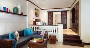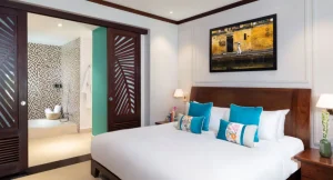 Deluxe River View Suite: Located on the ground floor overlooking the tranquil Thu Bon River, take in the view from your indoor living area or private terrace with daybeds for the ultimate relaxation. A spacious bathroom invites you to enjoy a long, relaxing soak in the luxurious bathtub with soothing Anantara Spa products.