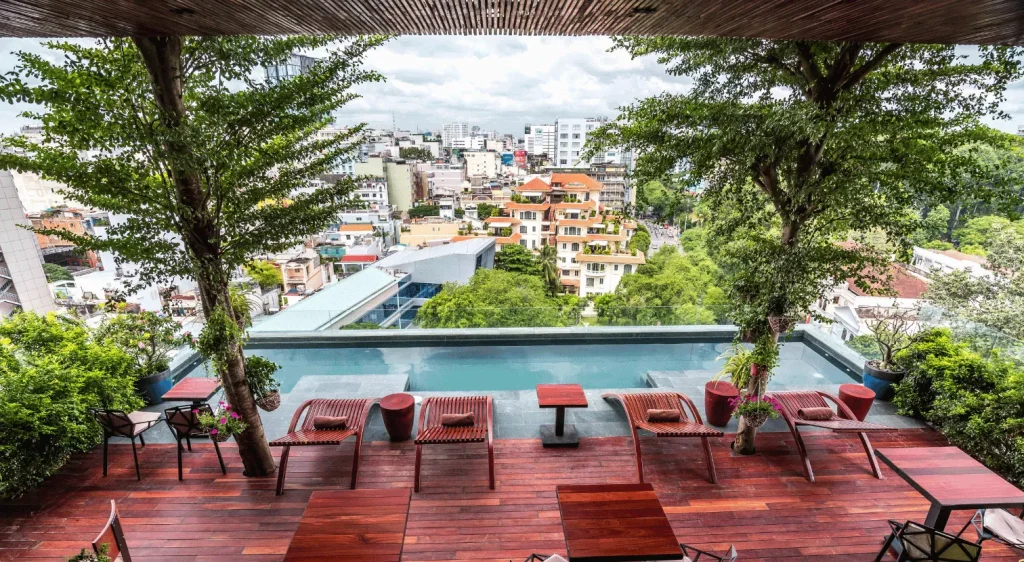 Relax and unwind in the hotel’s rooftop outdoor jacuzzi and enjoy drinks after a long day in the rooftop bar whilst overlooking the captivating views of the city and downtown Saigon.